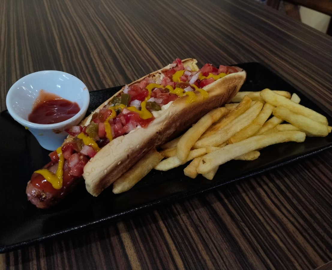 Salchicha de Pavo (30cm) con jitomate, cebolla, chile curado y mostaza