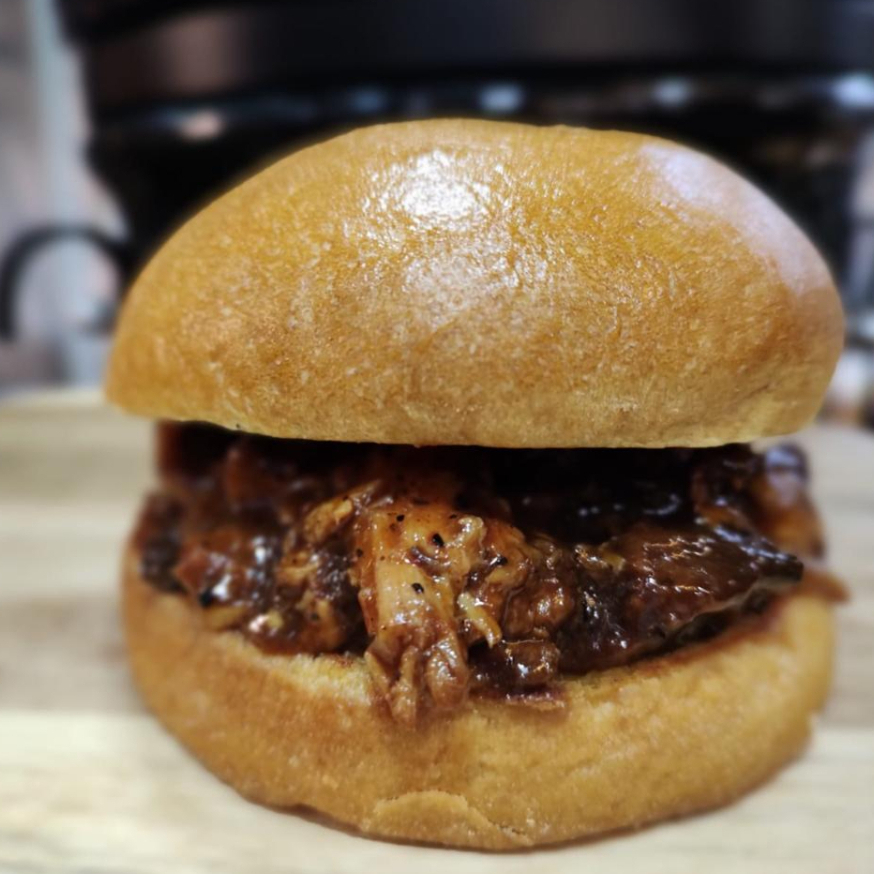 Carne de res bañada en salsa BBQ, pan Brioche, Aros de cebolla, Queso Gouda, Lechuga, Jitomate y Mayonesa de la casa