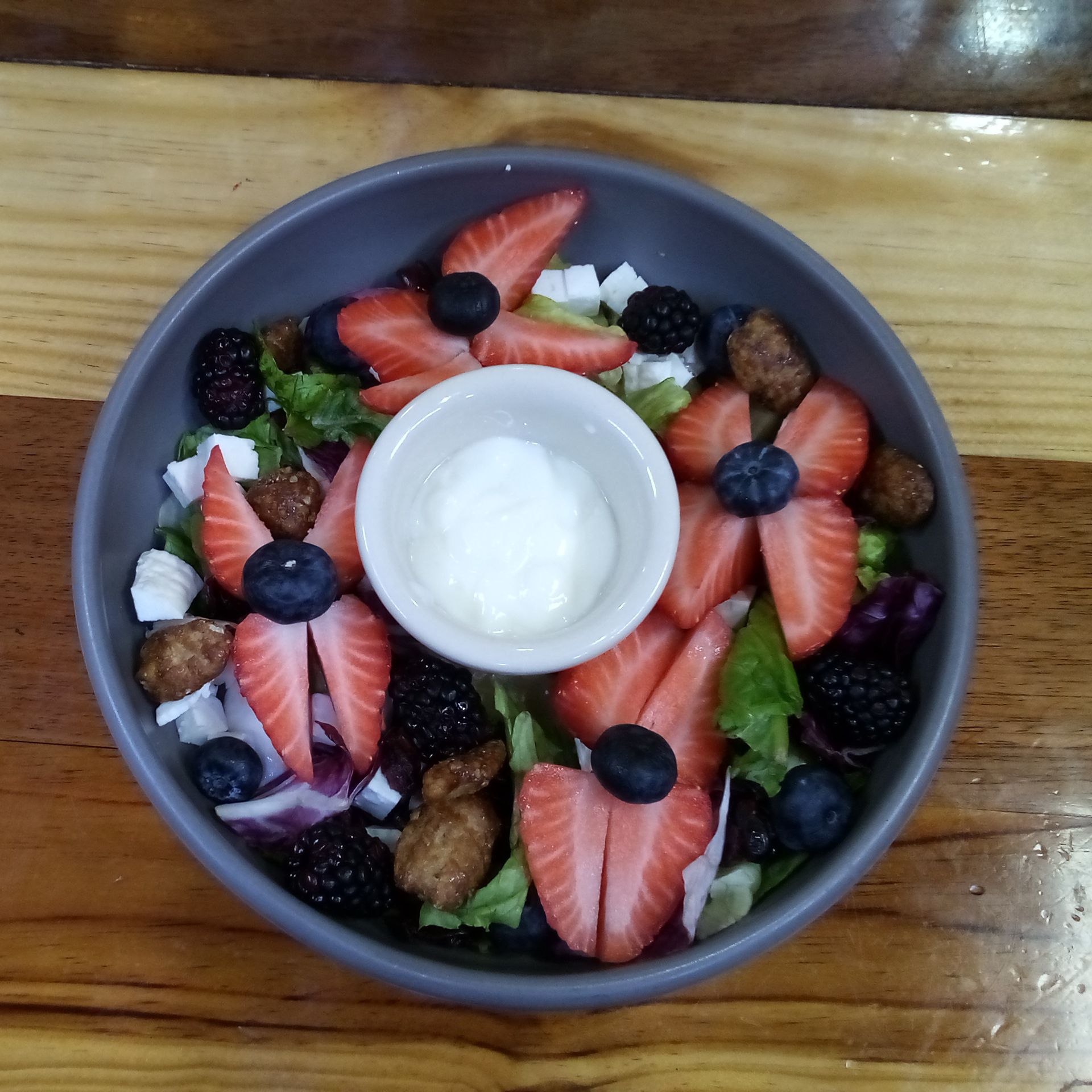 Mezcla de Lechugas Italianas, Queso Panela, Nuez Garapiñada, Frutos Rojos y Aderezo de Yogurt Natural