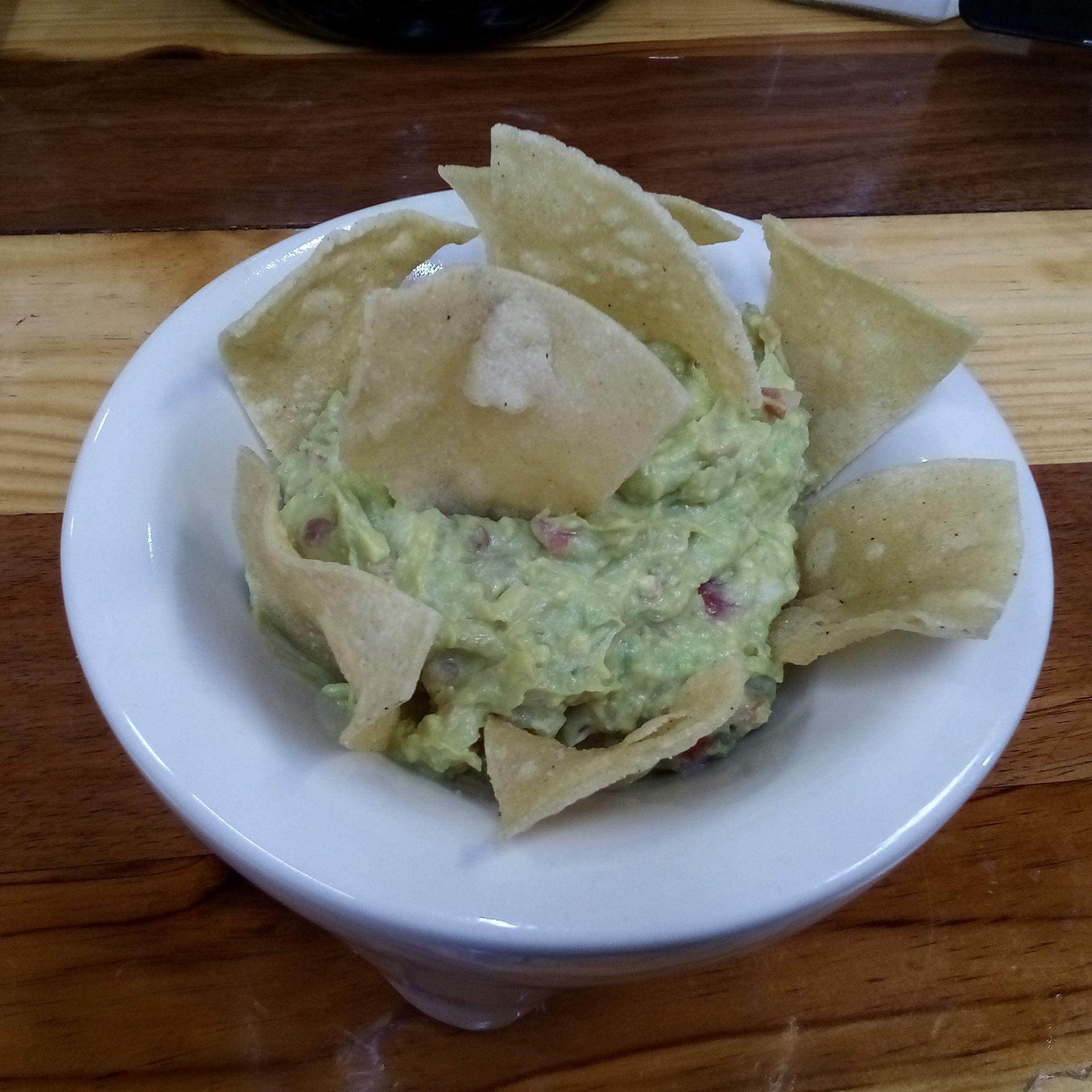 Aguacate, chile serrano, jitomate y cebolla, acompañado e trozos de chicharrón Rib-Eye