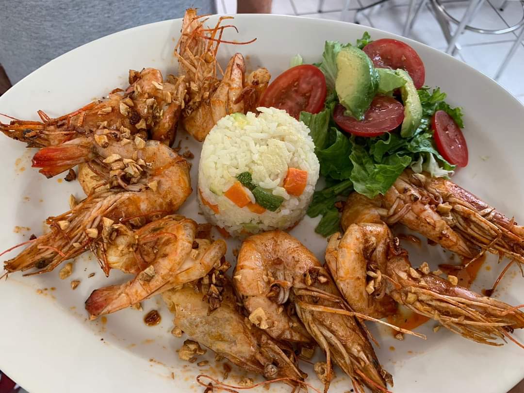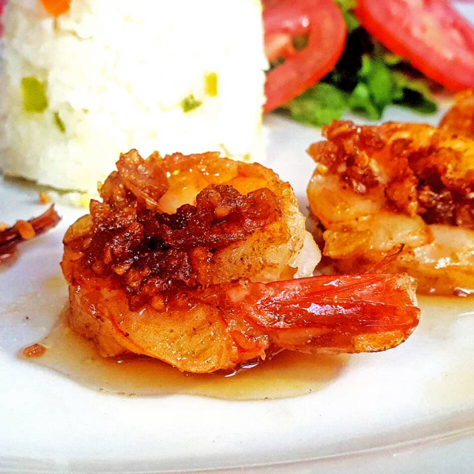 Camarones (180g) con ajo frito, guarnición de arroz y ensalada.