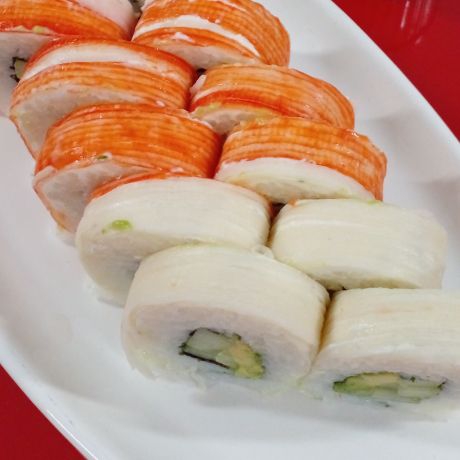 Camarón, pepino, aguacate, queso Philadelphia y coco dorado por fuera. (12 bocados)