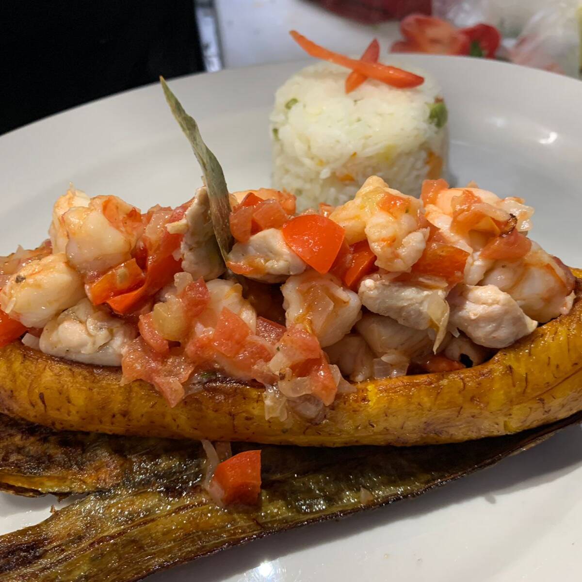 Plátano macho frito, relleno de estofado de mariscos, guarnición arroz y aguacate.