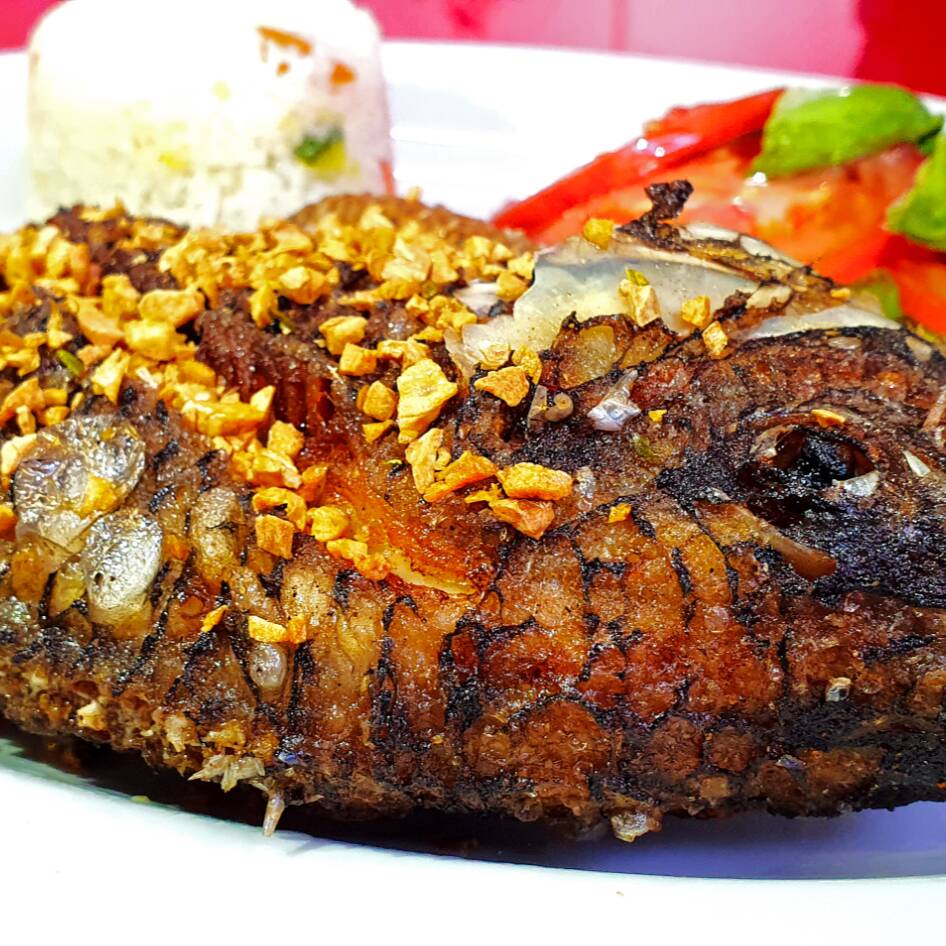 Mojarra (800g) con ajo frito, guarnición de arroz y ensalada.