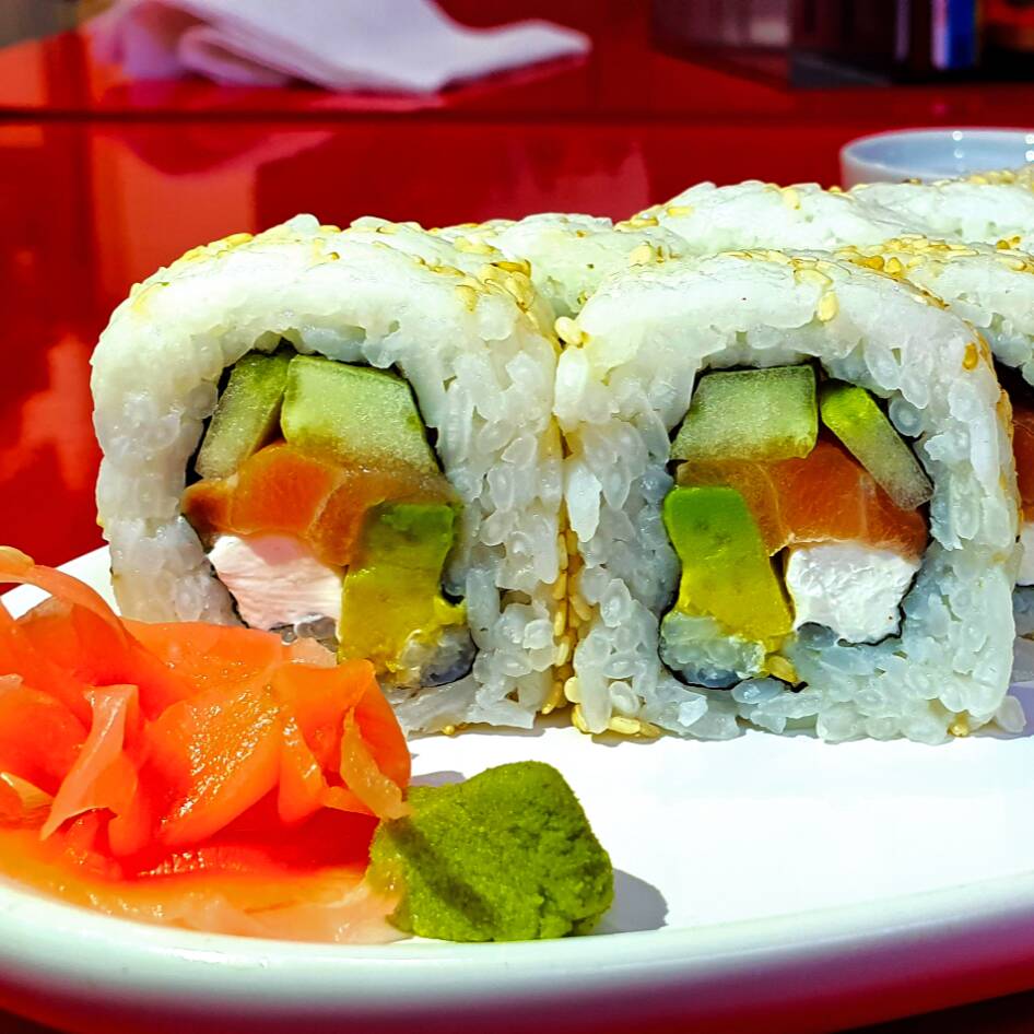 Salmón por fuera, aguacate, pepino, queso Philadelphia. (12 bocados)