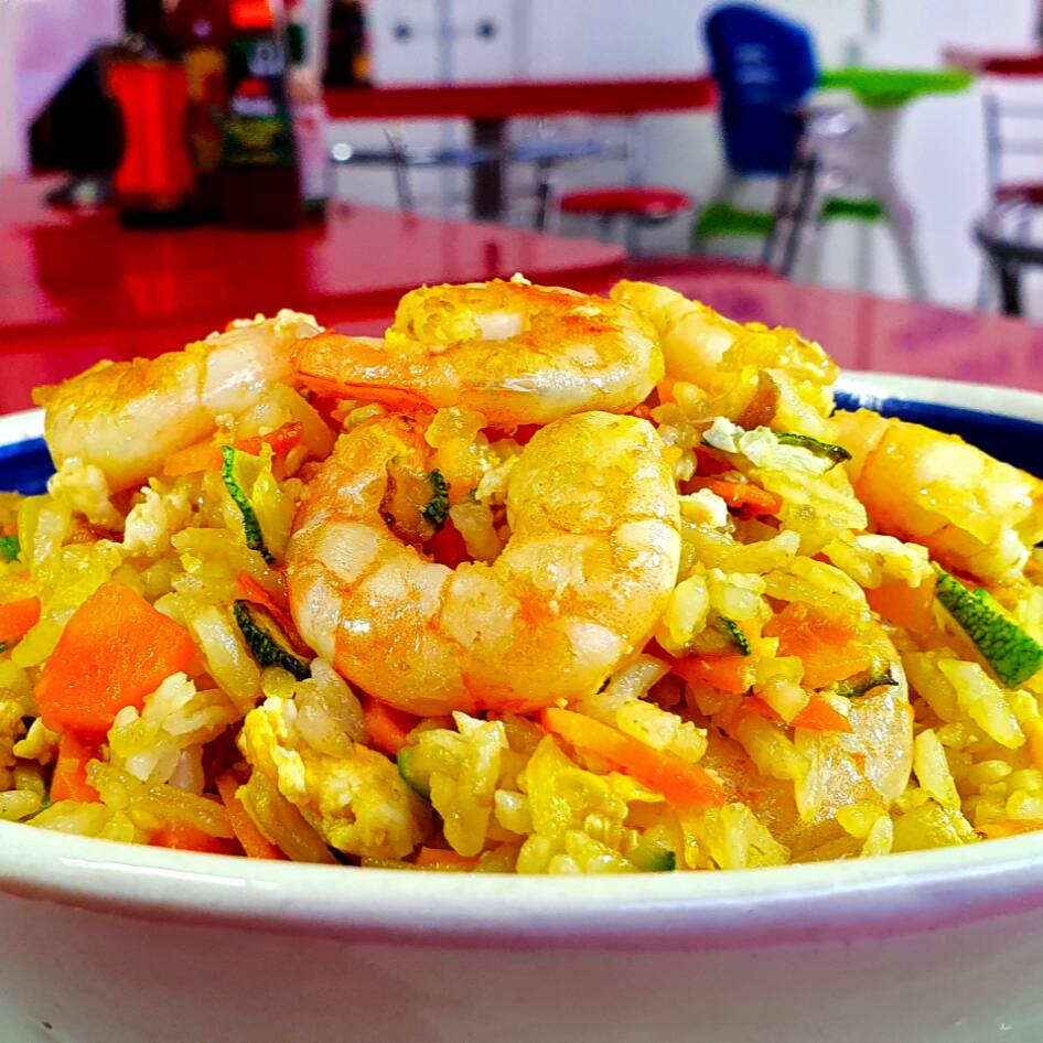 Arroz frito con verduras, huevo y camarón, se acompaña con soya y chiles toreados (280g).