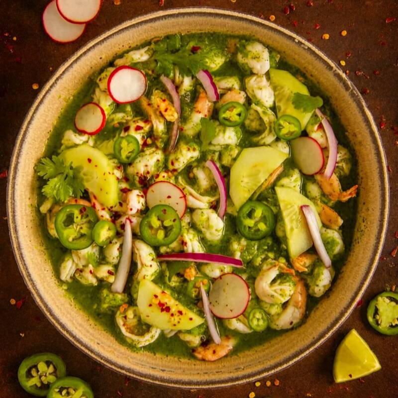 120grs de camarones abiertos estilo mariposa curtidos en limón,bañados en salsa verde con pepino, cebolla morada y un toque de chile. Frescura sinaloense total