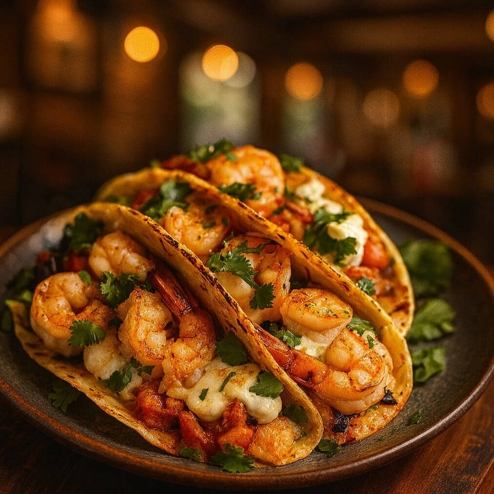 Tortillas doradas a la plancha, rellenas con camarones salteados en mantequilla y especias, bañados en una mezcla cremosa de queso Chihuahua fundido, jitomate fresco, cebolla morada, pimientos y chile ancho. Decorados con cilantro recién picado