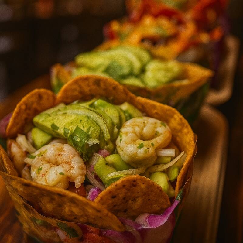 Una explosión de sabor costero servida sobre una cama crujiente de totopos. 120gr de Camarones frescos curtidos al momento, mezclados con aguacate cremoso, pepino crujiente, cebolla morada, cilantro fresco y un toque de salsa especial estilo Sinaloa que equilibra lo ácido, lo picante y lo sabroso.