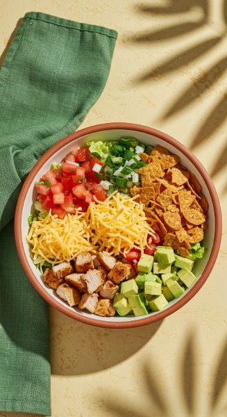 Ensalada a base de lechuga con pollo en cubos (120 g), queso cheddar, pico de gallo, aguacate, totopos y vinagreta a elección.