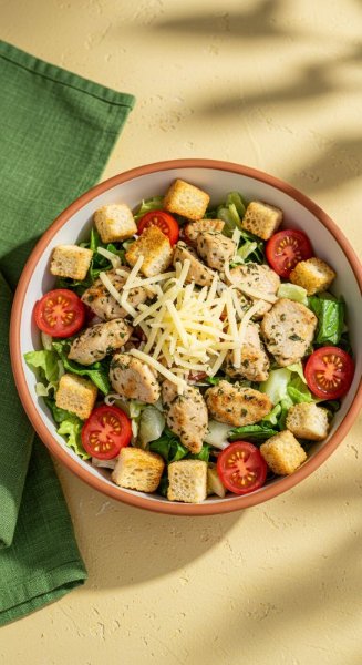 Ensalada a base de lechuga con pechuga de pollo a la plancha (120g), queso parmesano, jitomate, crutones y vinagreta a elección.