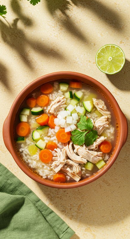 Consomé de pollo con trozos de pollo (35 g), arroz, zanahoria, zucchini, cebolla, cilantro y limón.