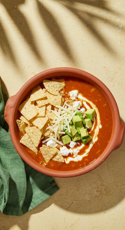 Exquisita sopa de tortilla, servida con totopos de maíz crujientes, crema, queso cotija y cubos de aguacate.