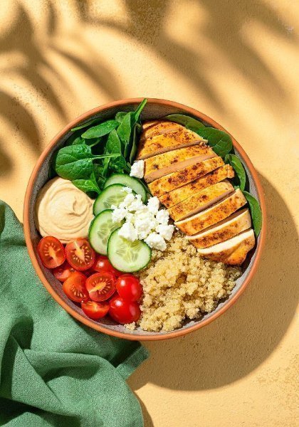 Bowl con base de quinoa, pollo a la plancha (120 g) espinaca fresca, queso de cabra, tomate cherry, pepino crujiente, hummus de garbanzo y vinagreta a elección.