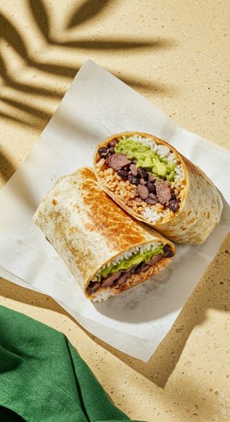 Tortilla de harina rellena de arrachera, queso mozzarella, frijoles refritos, arroz blanco, guacamole y salsa de la casa.