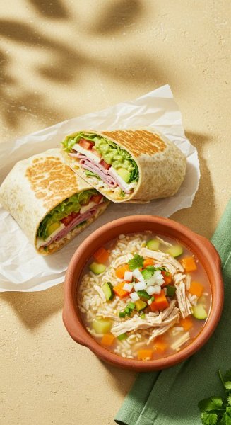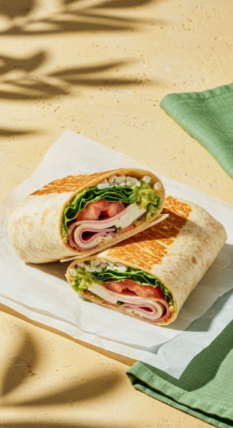 Wrap en tortilla de harina relleno con jamón de pavo, queso mozzarella, lechuga, jitomate, guacamole y alioli.