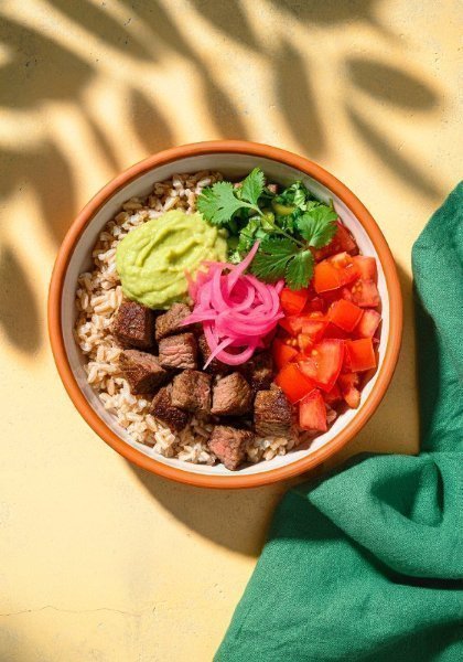 Bowl con base de arroz integral, arrachera (110 g), acompañado de brócoli rostizado, tomate cherry, aguacate, cebolla encurtida picante, cilantro fresco y vinagreta a elección.