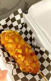 Salchicha frankfurt combinada con queso manchego bañada de masa con cubierta de panko, bañada con el aderezo de su elección, acompañadas con papas a la francesa.