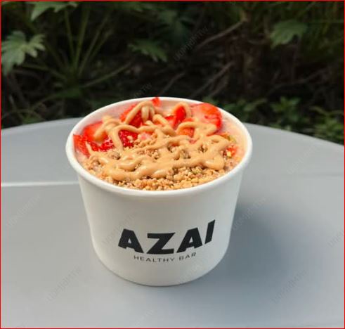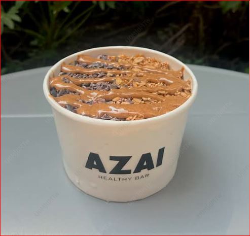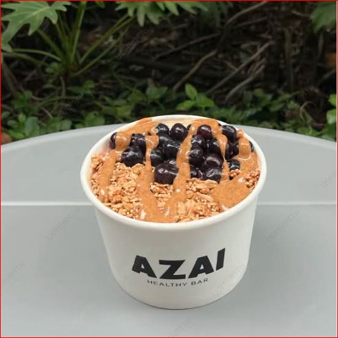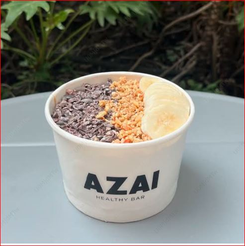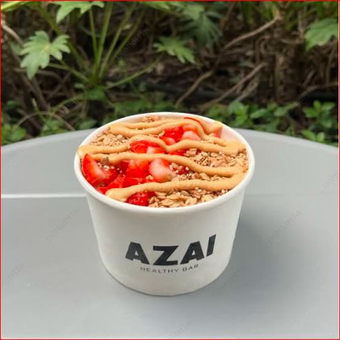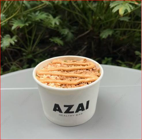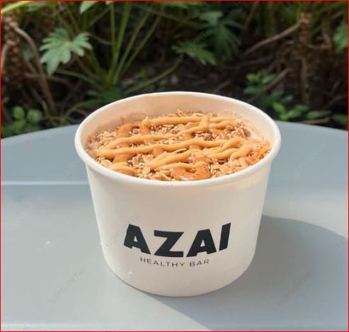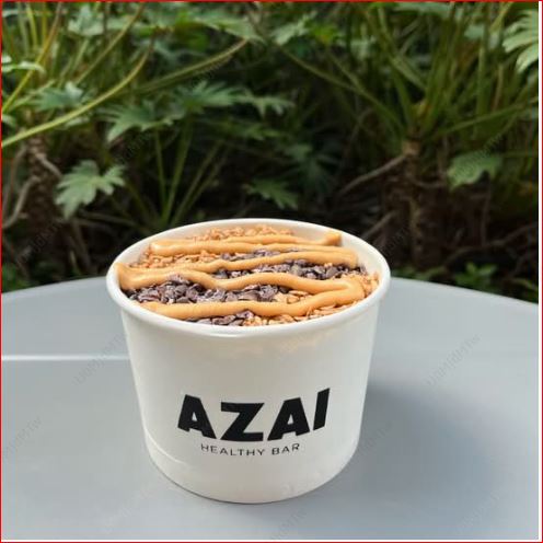 Base açaí healthy con leche de almendras, toppings: cacao nibs, granola y peanut butter (16 onzas).
