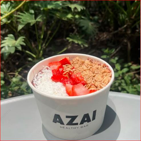 Agua de coco orgánica, mango, piña, toque de plátano y miel, topping: coco, fresa, granola.