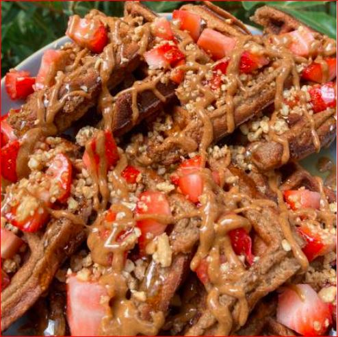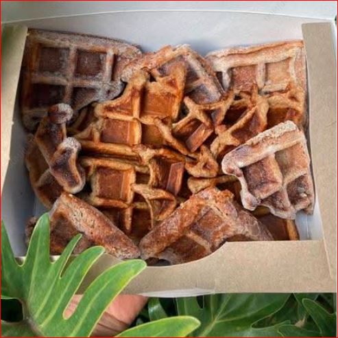 8 Porciones de waffles hechos con leche de almendra sin azúcar, plátano, avena y proteína vegana de chocolate (incluye cacao nibs y miel).