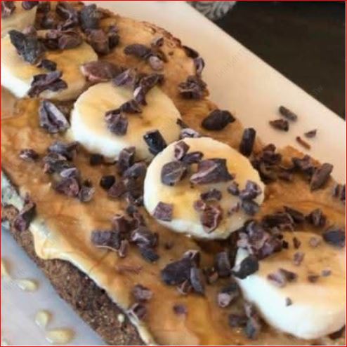 Pan orgánico untado de PB 100% natural, acompañada de slides de plátano y cacao nibs con un toque de miel.