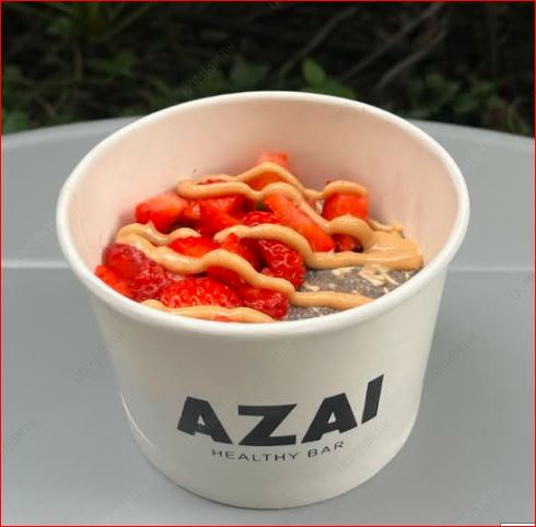 Excelente desayuno, pudin de avena con chía, con un toque de miel, toppings: fresa o plátano y crema de almendras o crema de cacahuate (especificar).