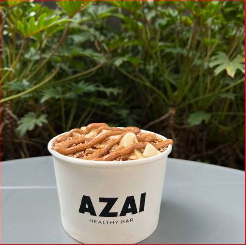 Leche de almendras sin azúcar, acai, peanut butter, plátano y toque de miel, toppings: cacao nibs, crumble y plátano (16 onzas).