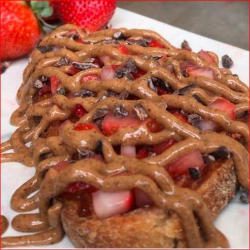 Pan orgánico untado con un toque de mermelada fresca sin azúcar, encima fresas cubiertas de almond butter y un toque de cacao nibs.