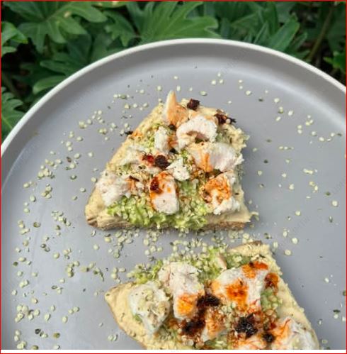Pan masa madre untado con hummus orgánico, aguacate, pavo, toque de hemp y salsa macha.