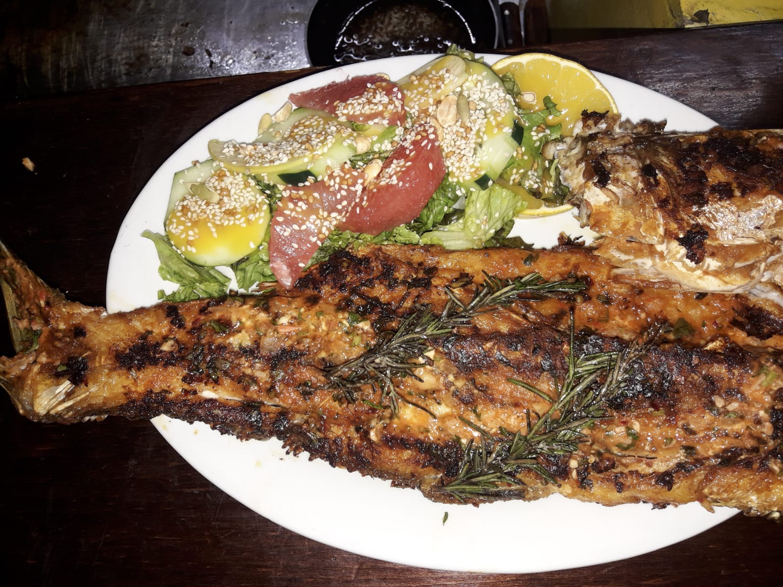 Mojarra de 1 kg. al gusto, ajillo mojo, frita talla con ensalada cítrica y arroz