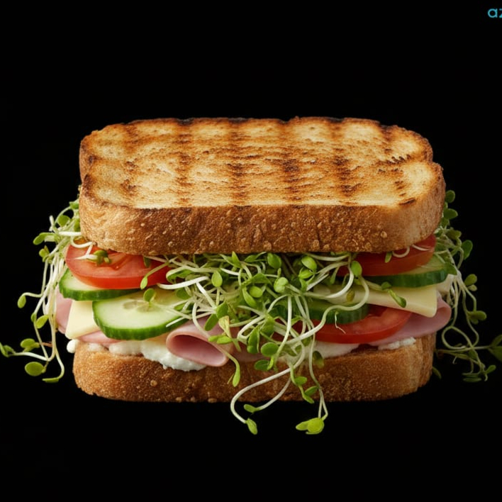 Jamon de pechuga de Pavo, pepino, jitomate, aguacate, germen de alfalfa y queso panela.