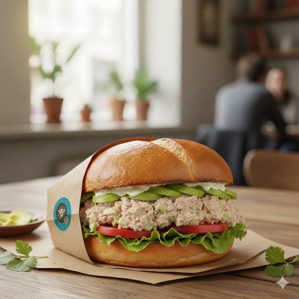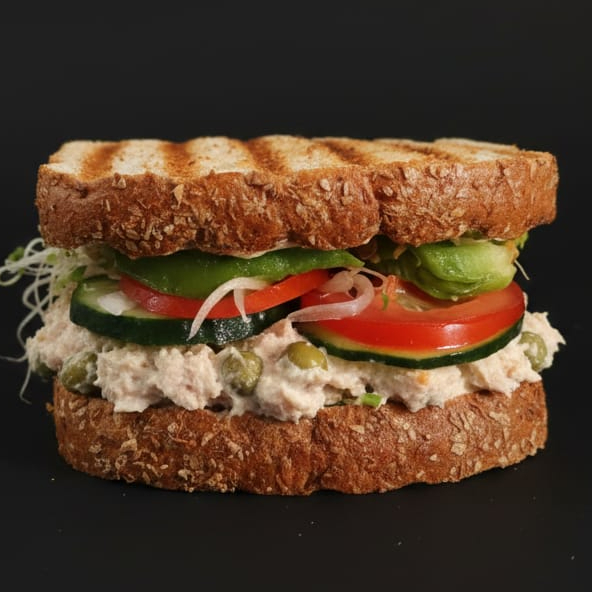 Pan Integral, Mayonesa, ensalada de atún, jitomate, aguacate, germen de alfalfa y queso panela.
