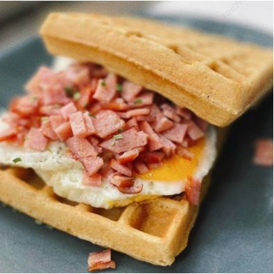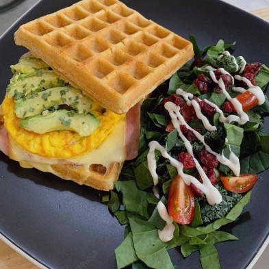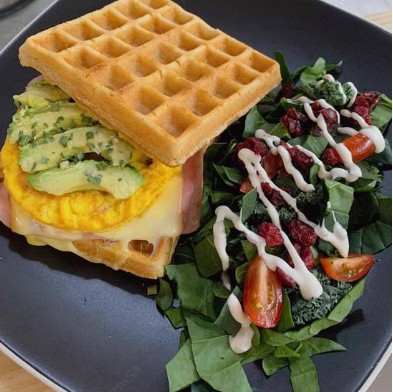 2 Waffles, huevo revuelto, jamón, aguacate, queso gouda, cebollín, palomitas o mini ensalada.