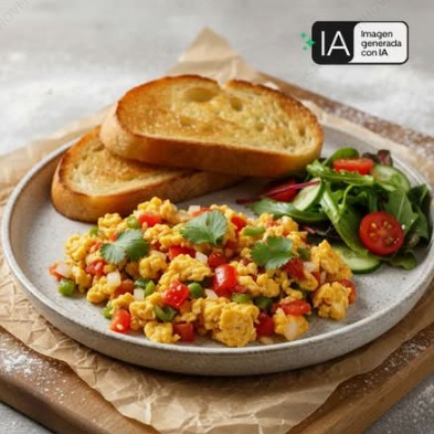 3 Huevos a la mexicana, pan tostado y mini ensalada.