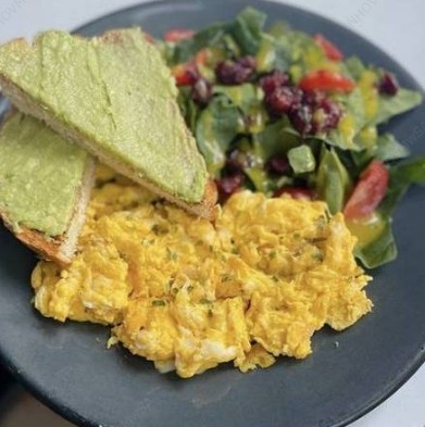 3 Huevos revueltos con queso mozzarella, pan tostado y mini ensalada.