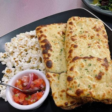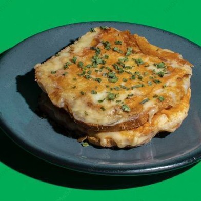 Sándwich de tres quesos (americano, gouda y mozzarella), gratinado, salsa de tomate con albahaca y pimienta, palomitas o mini ensalada.