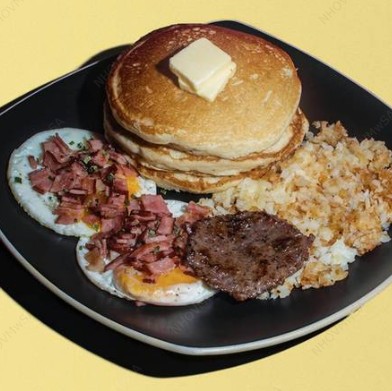 3 Pancakes, 2 huevos estrellados o revueltos, papa hash brown, tocino, salchicha hecha en casa.