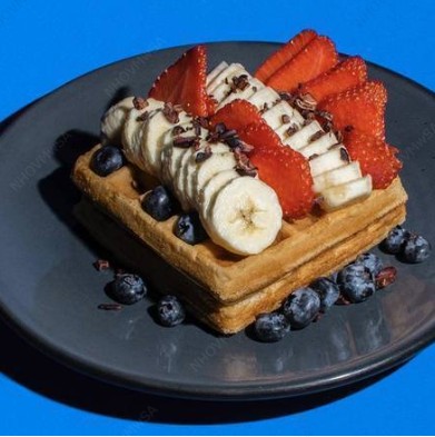 2 Deliciosos waffles, fresas, moras y plátano, chocolate líquido, nibs de cacao.