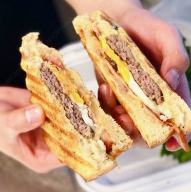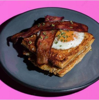 2 Waffles gratinados con queso mozzarella, costra de papa hash brown con queso, 1 huevo estrellado, tocino.