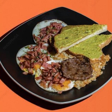 3 Huevos, papa hash brown, pan tostado con aguacate, tocino, salchicha hecha en casa. 3 Eggs (scrambled or sunny side up), hash brown, toast with avocado, bacon, breakfast sausage.