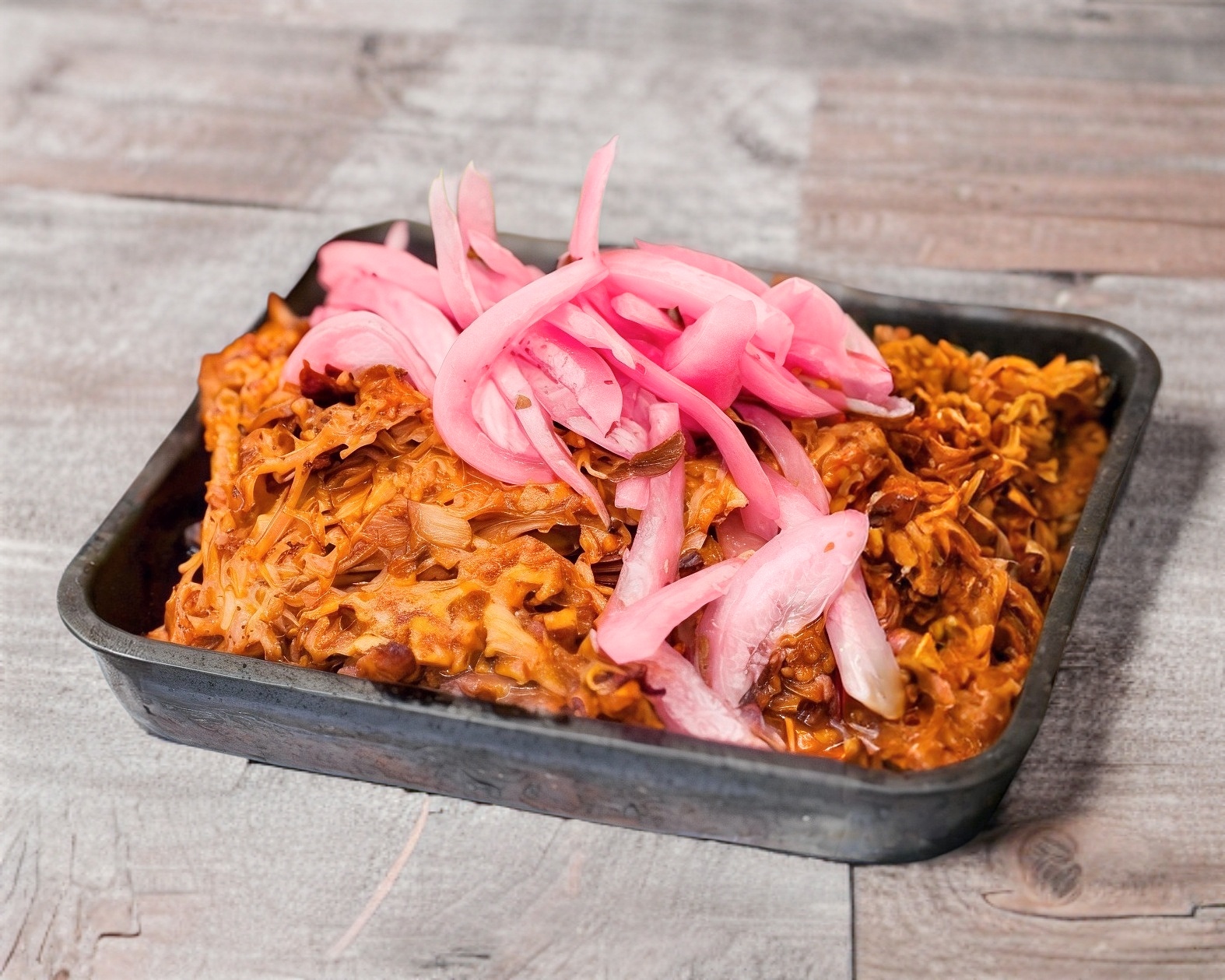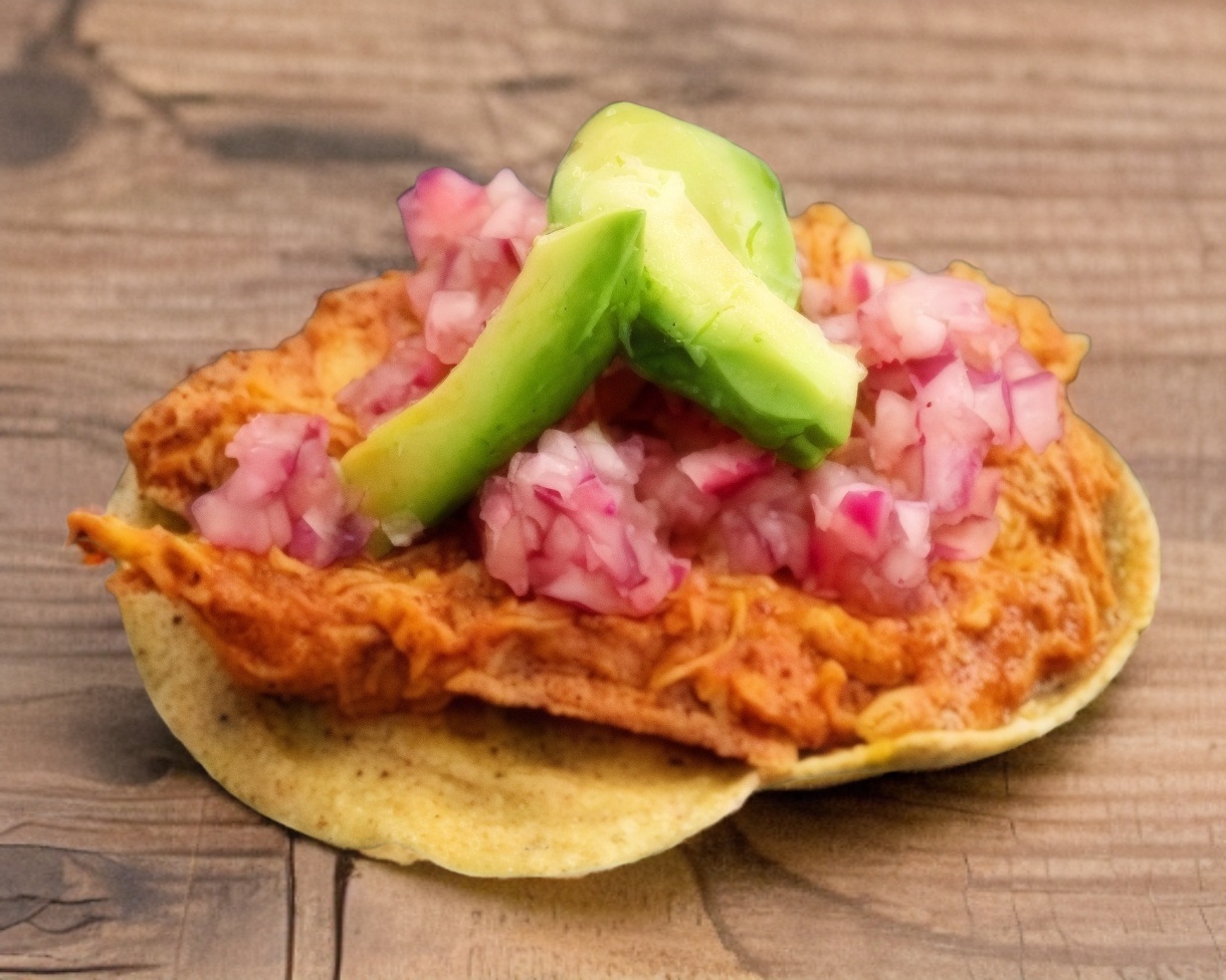 Quesadilla de queso Oaxaca adobada en nuestra salsa secreta y rellena de cochinita pibil, elaborada con tortilla de maíz. Se acompaña de cebolla morada curtida, salsa de habanero 100% y limón.