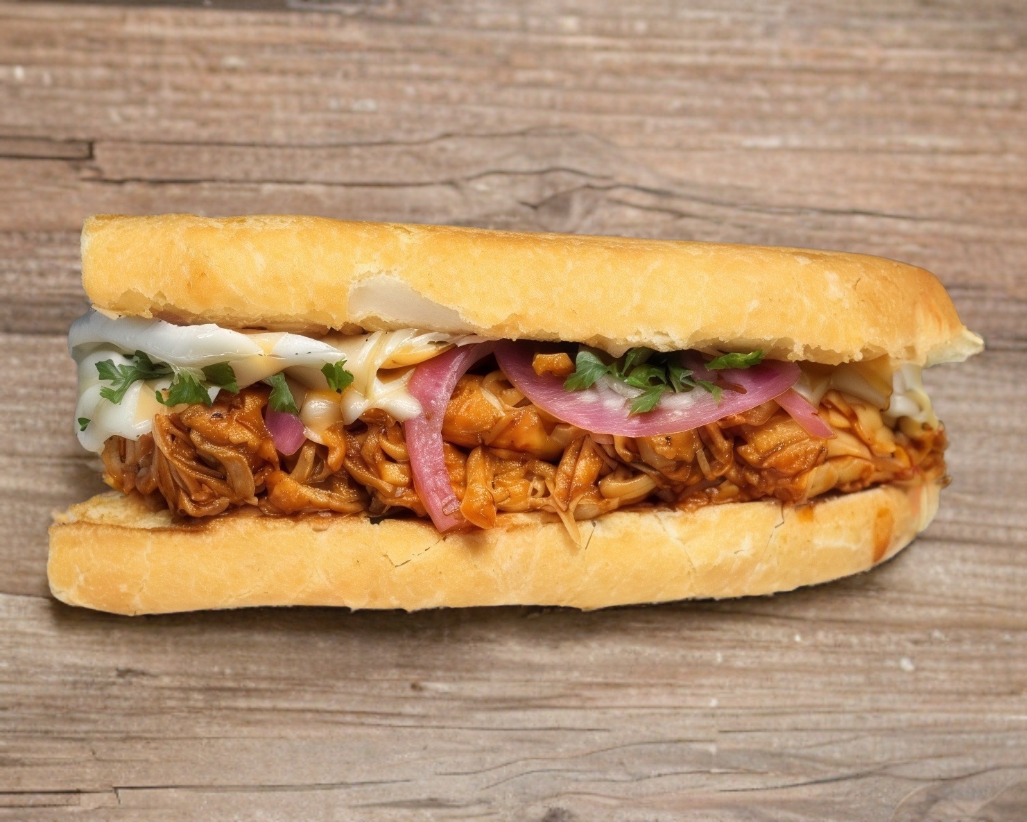 Deliciosa cochinita pibil al estilo Mérida en una baguette gratinado con queso Oaxaca acompañada de fríjol, aguacate, cebolla morada y nuestra salsa habanera por separado.