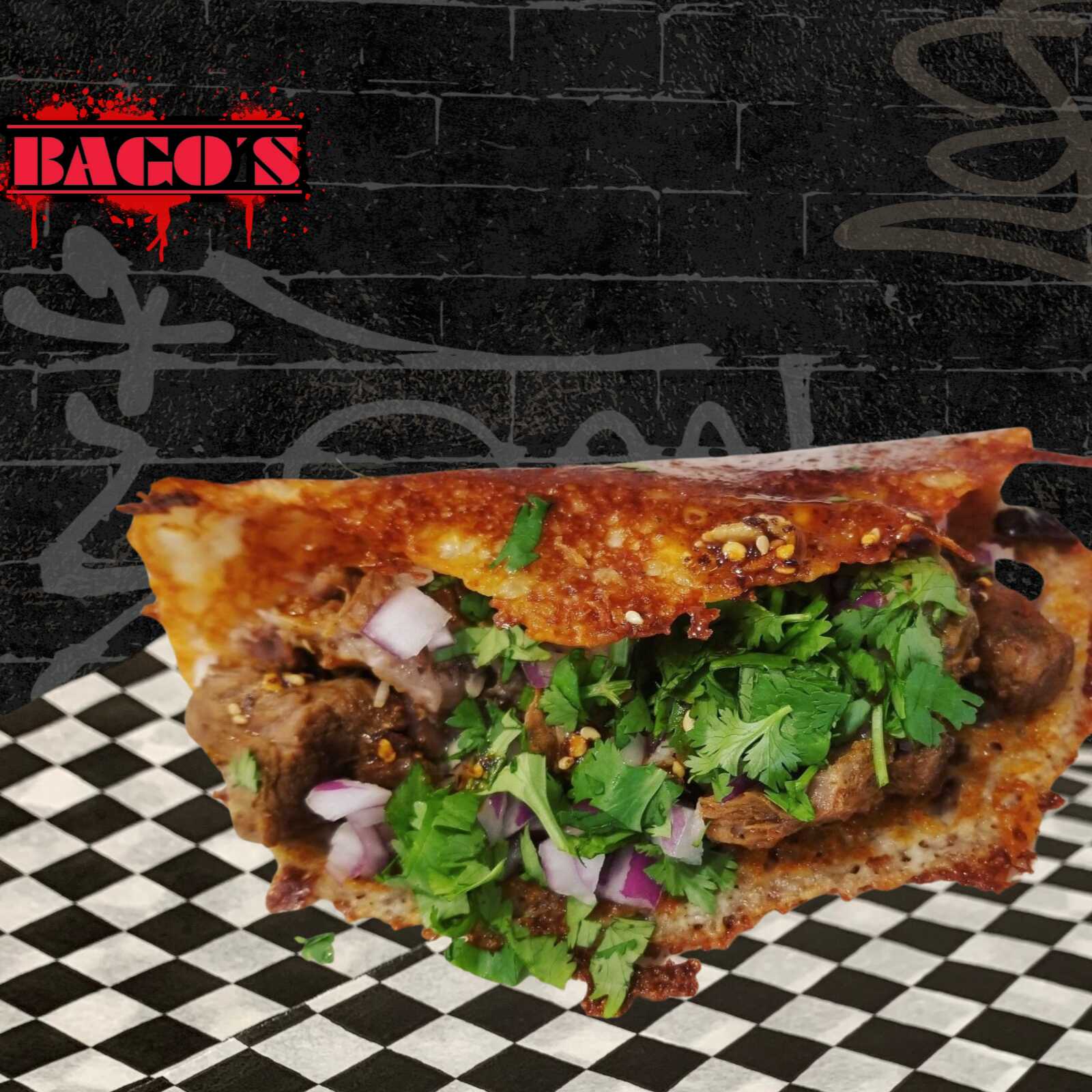 Costra de Queso Manchego fundido a la plancha relleno de Birria servido sobre una tortilla de harina. Por aparte se acompaña de Cebolla y cilantro limón y Salsa de chile de árbol