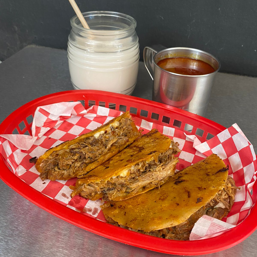 Orden de tres quesabirrias, hechas con tortilla de maíz frita con quesillo y birria de res acompañada de cilantro con cebolla, salsa de árbol, limones y un vaso de consomé.