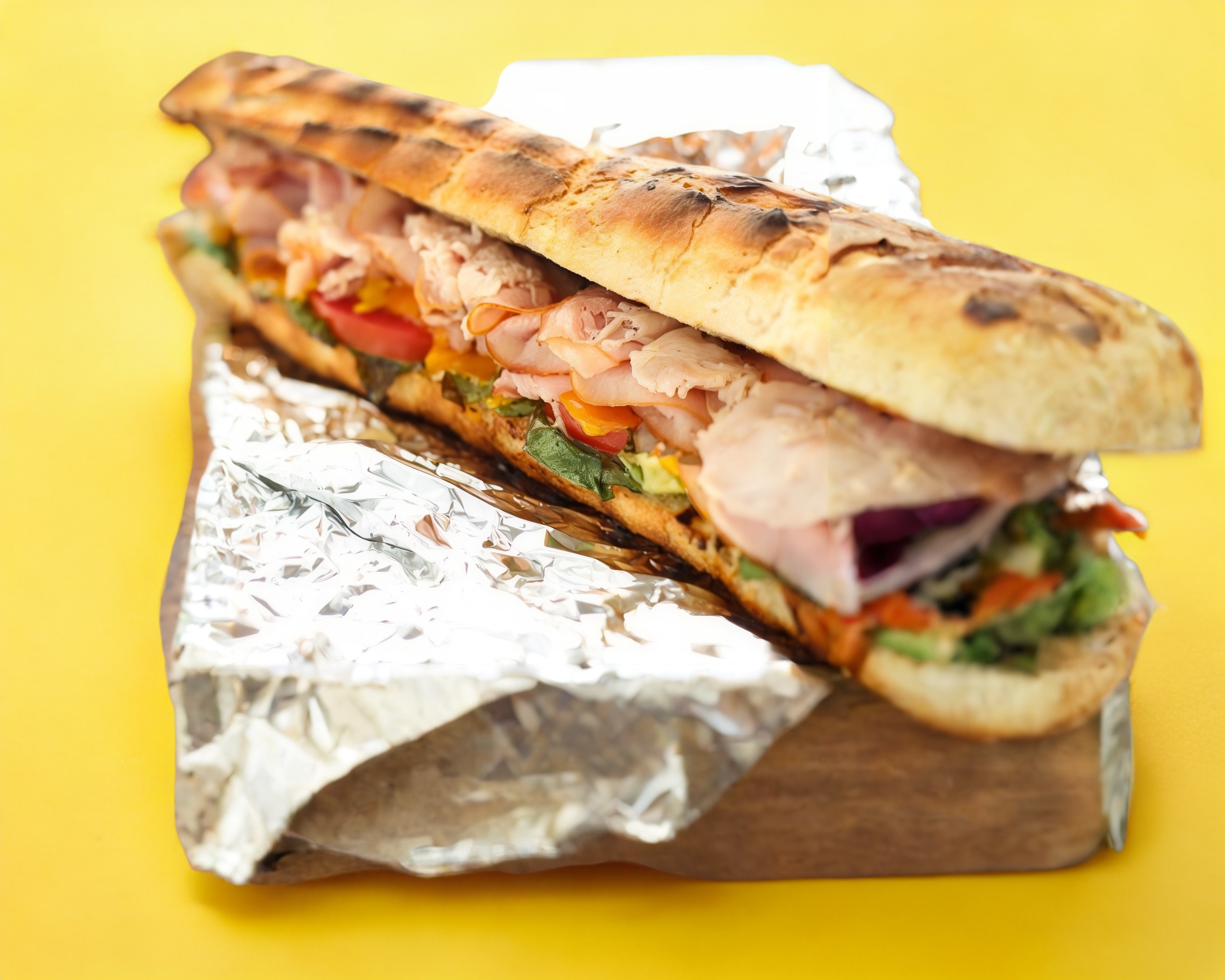 Baguette de masa madre con jamón de pavo, jamón serrano, salami y queso a elección.