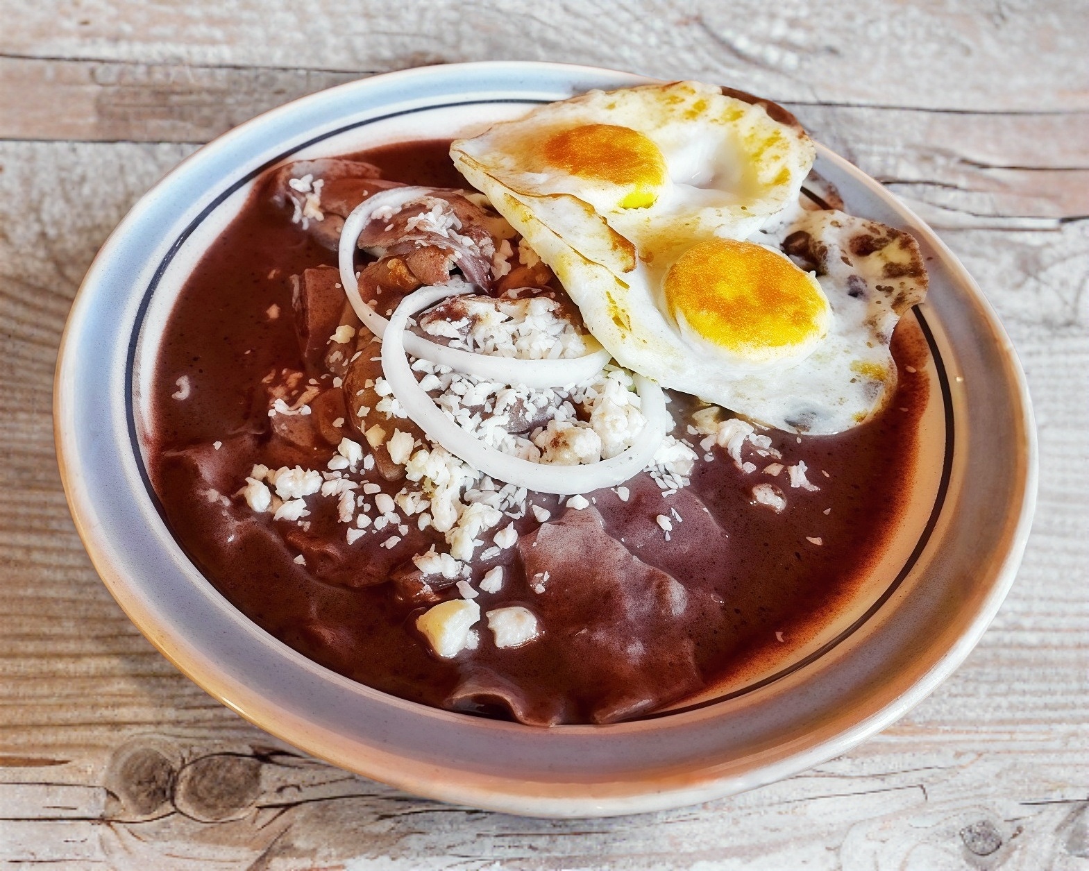 4 tortillas rellenas de pollo, bañadas en salsa de frijol, acompañadas de chorizo, queso cotija, crema, huevo al gusto y aguacate