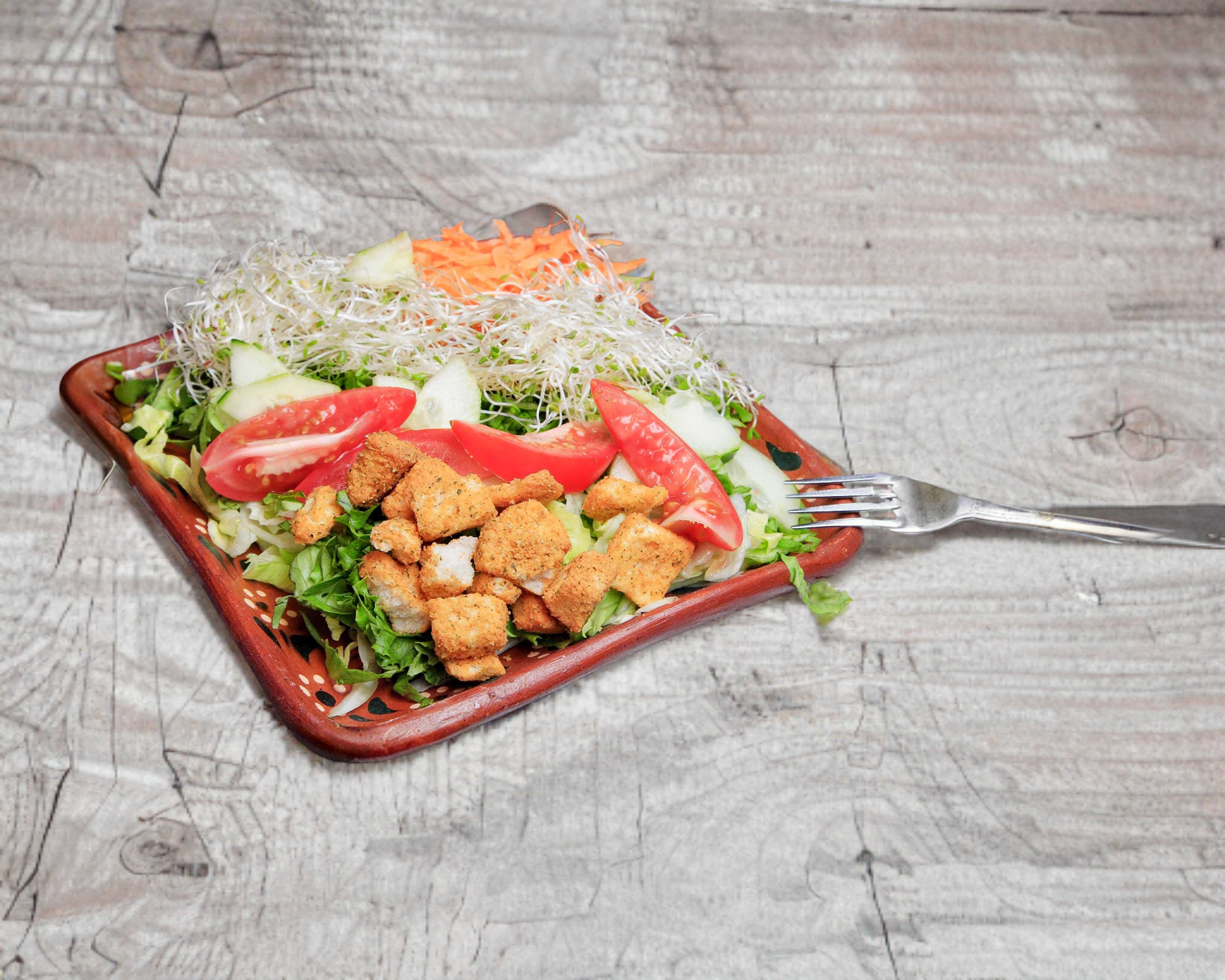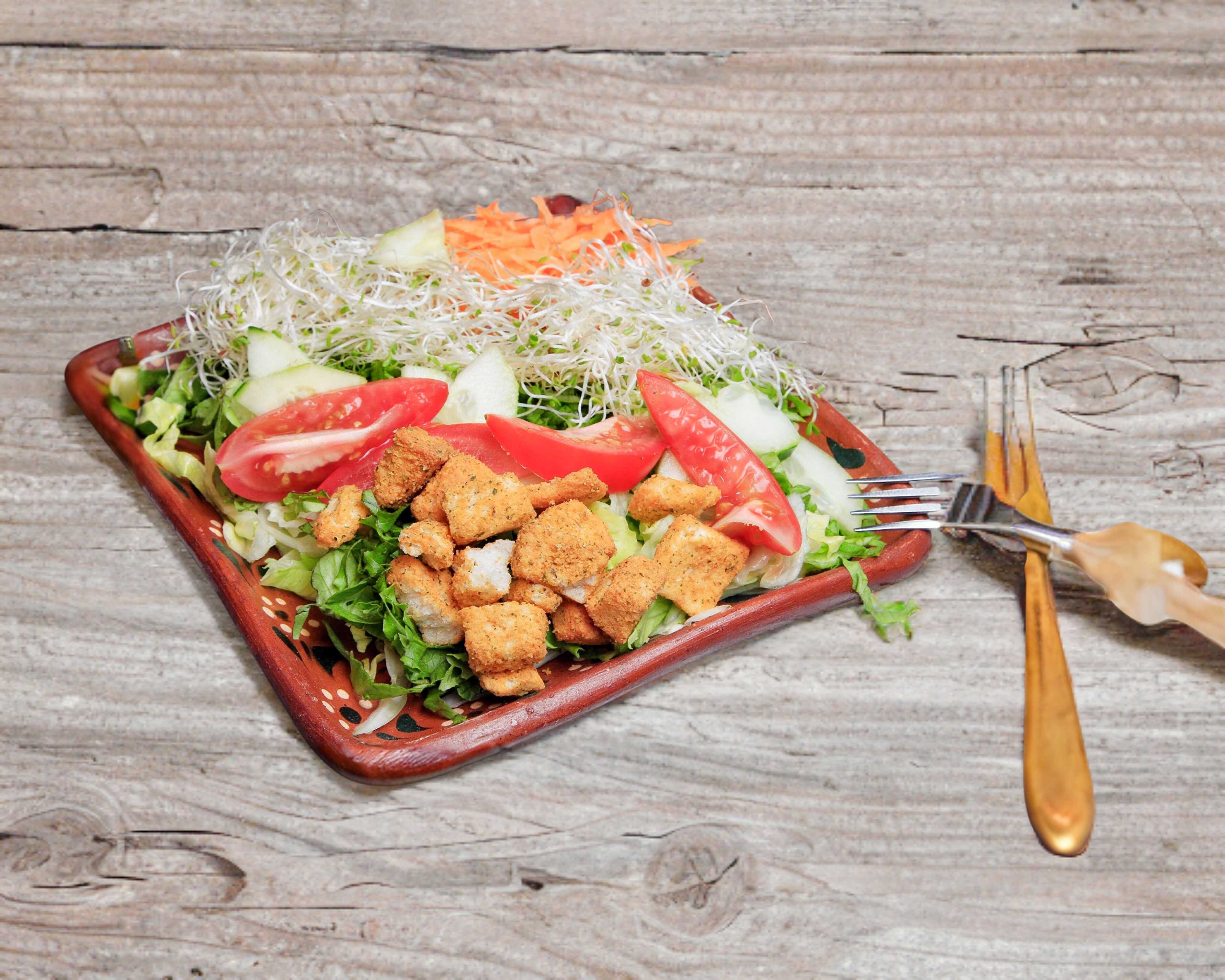 500 gms, mix de lechugas, espinacas, zanahoria, germen de trigo, jitomate, pepino, crutones, proteína y aderezo a elegir.