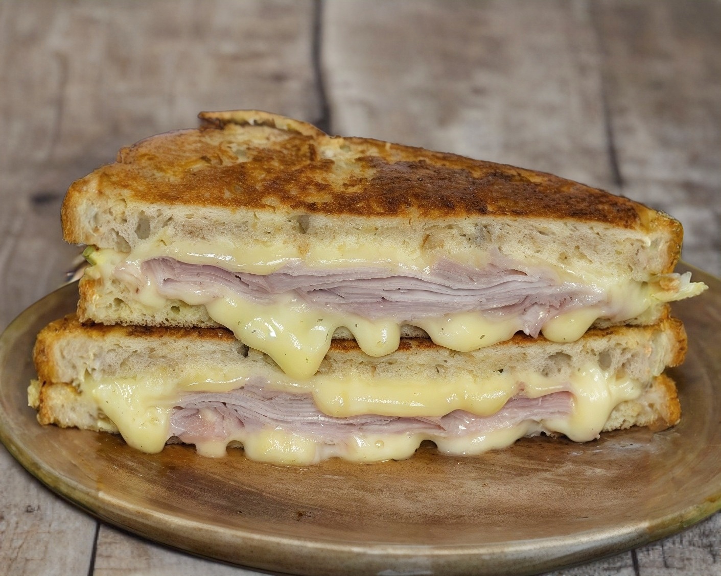2 rebanadas de pan estilo texas toast, jamón de pavo, jamón de pierna, queso suizo, bañado de huevo y mantequilla, mayonesa de chipotle, mostaza