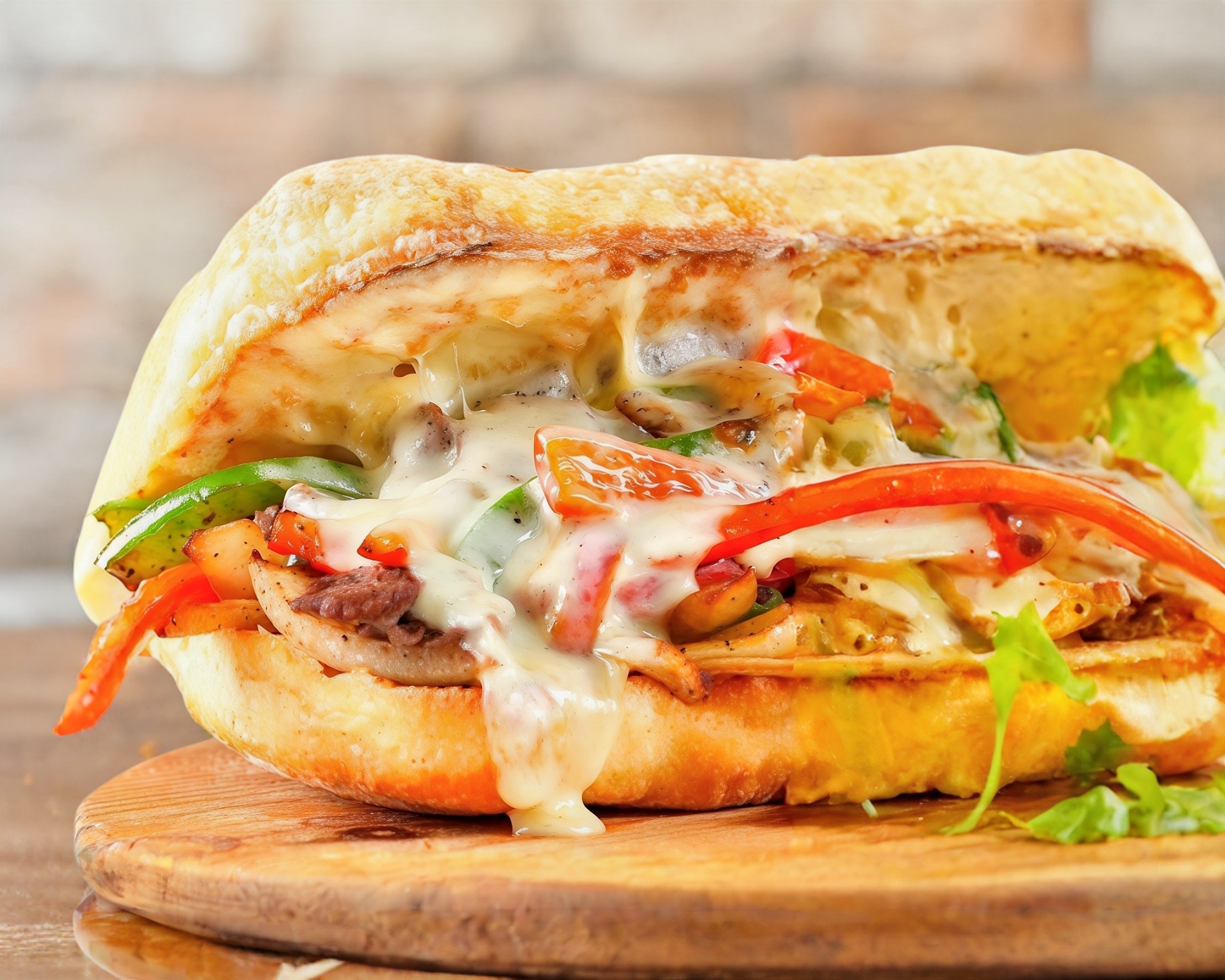 pan chapata, rellena de frijoles, cebolla, arrachera asada, queso manchego, pimientos asados y aguacate.